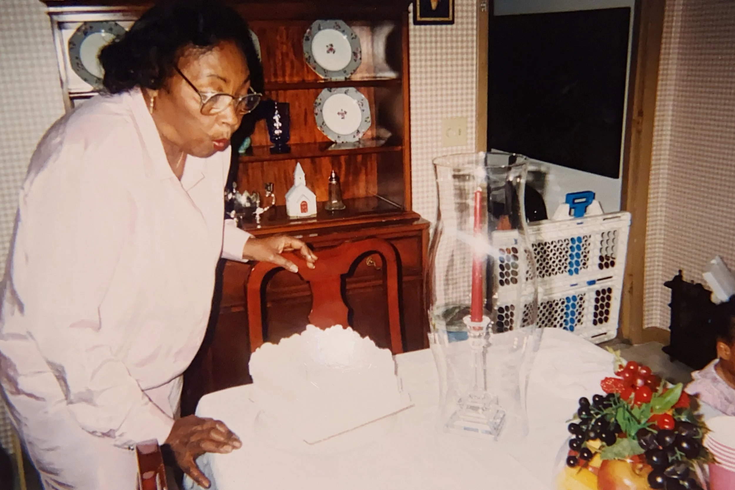 Adorned in a soft pink set, Sarah Elizabeth Jeminia Redd Tolbert blows out her birthday candles—an inspiration for the shop, a keeper of the story, and the soul of the space at Sarah E.